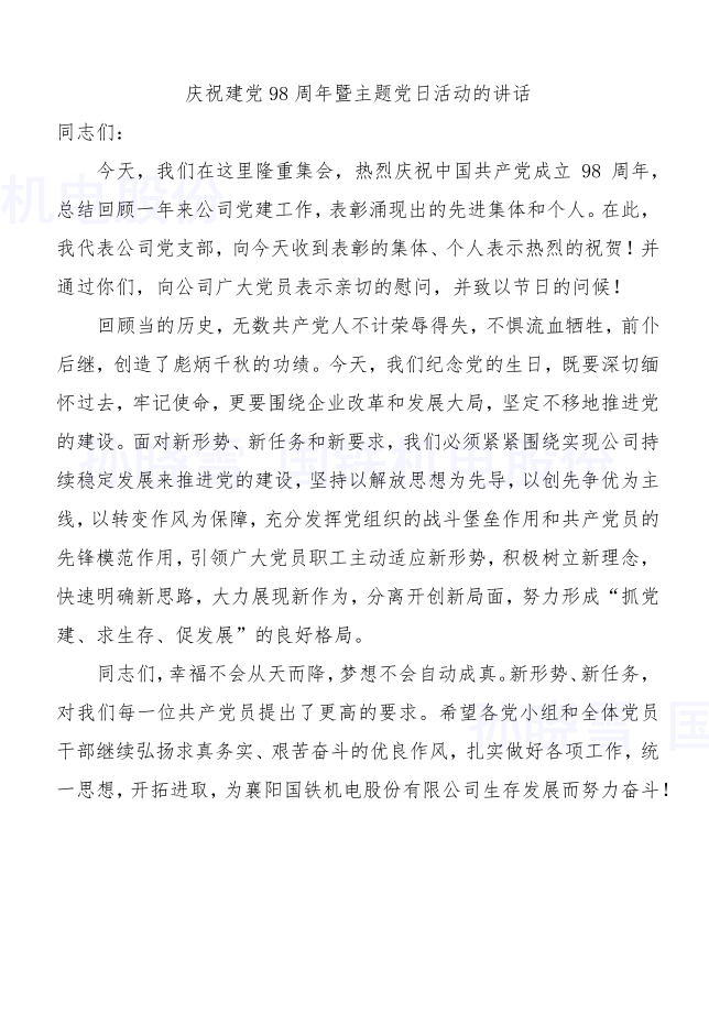 今年是建黨98周年。“七一”前后,襄陽國鐵機電股份有限公司開展了豐富多彩的紀念活動,以傳承紅色基因、弘揚革命精神,不忘初心、牢記使命,矢志為中華民族偉大復興中國夢努力奮斗。