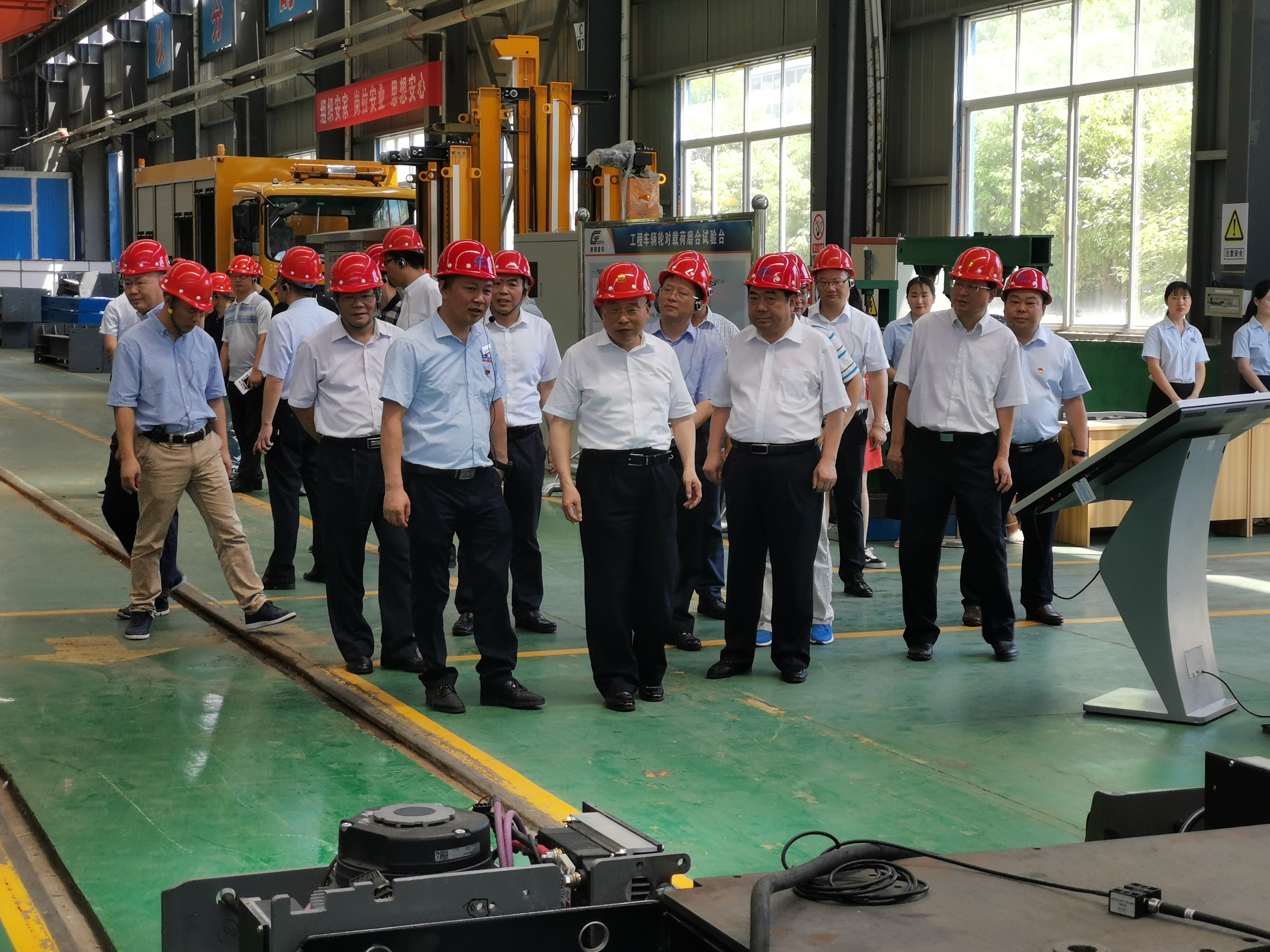 張清杰校長(zhǎng)、李德璋副市長(zhǎng)等一行走出展廳步入生產(chǎn)車(chē)間,邊走邊看,不時(shí)詢問(wèn)生產(chǎn)操作人員和技術(shù)人員,在新產(chǎn)品研發(fā)車(chē)間參觀了“輪對(duì)、受電弓在線激光檢測(cè)系統(tǒng)”、“公鐵兩用車(chē)”等創(chuàng)新產(chǎn)品。