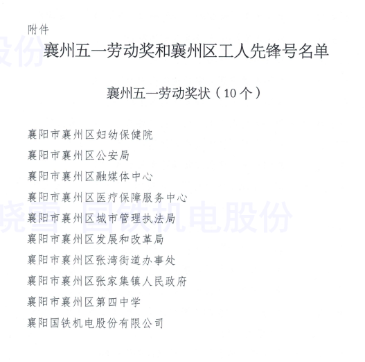 襄陽國鐵機電股份有限公司被襄州區總工會授予五一勞動獎狀
