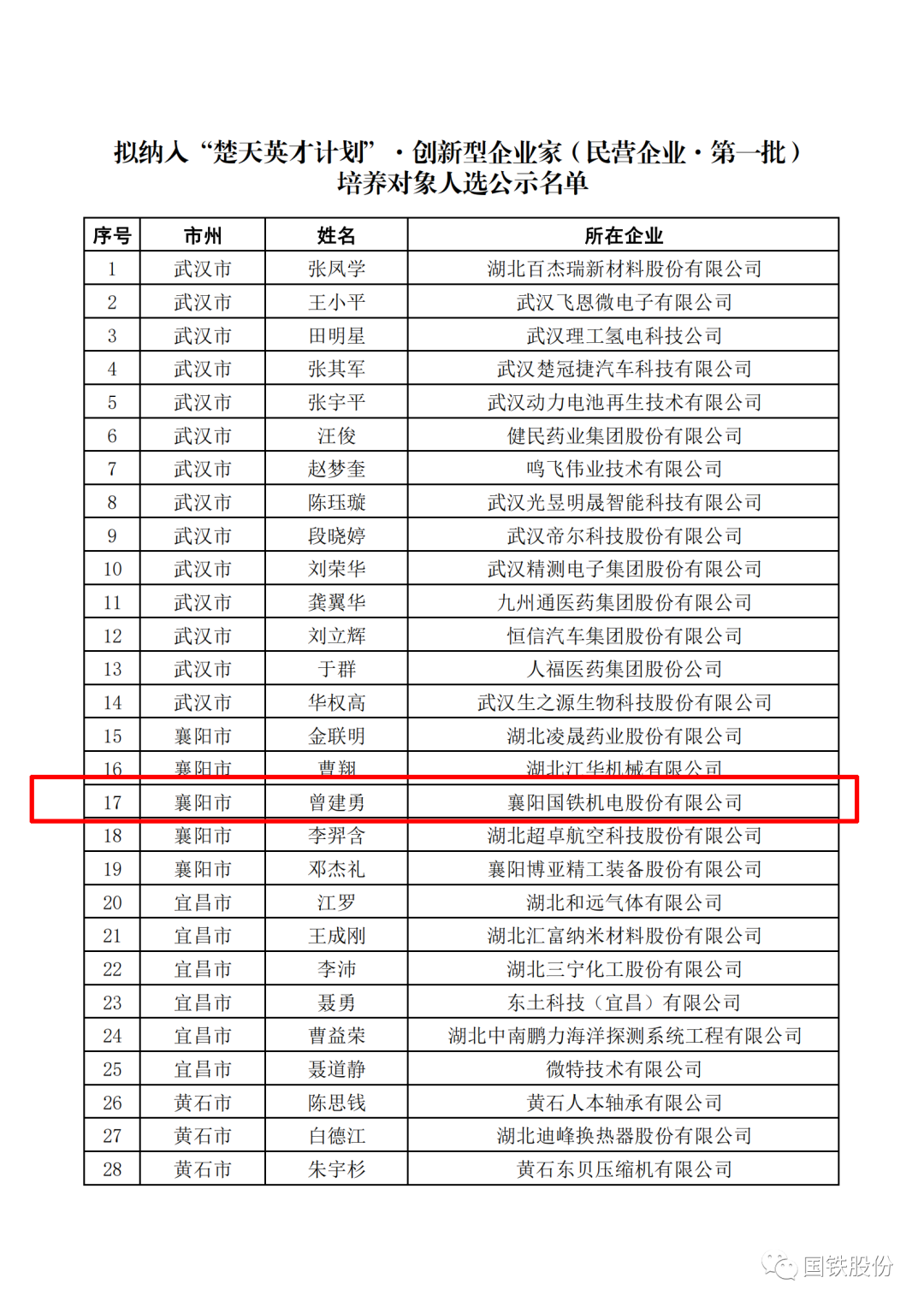 喜報!國鐵機電董事長曾建勇入選“楚天英才計劃”·創新型企業家培養對象